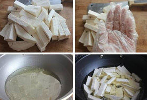 第一步:将芋头去皮切成条块状,切芋头时记得带手套或者手上蘸些盐水,这样手才不会痒。