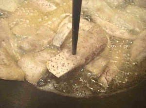 第四步:待到芋头能用筷子轻易插进去,证明芋头已经炸好了,乘出,晾凉。