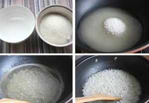 第一步:锅刷洗干净,将糖与水倒入锅中,比例2:1,小火慢熬,喜欢吃小葱、香菜的可以加入,这样吃起来会有一种别具一格的风味。