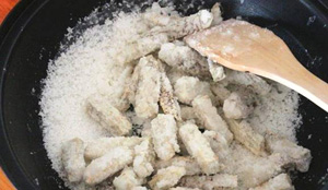 第二步:锅下油,待油九成热时,(油从锅底泛起油花时)芋头下锅并不断翻动,让芋头均匀受热,又能防止芋头黏锅。炸的过程中撒下少许盐,能让芋头吃起来不腻而且油不四溅。